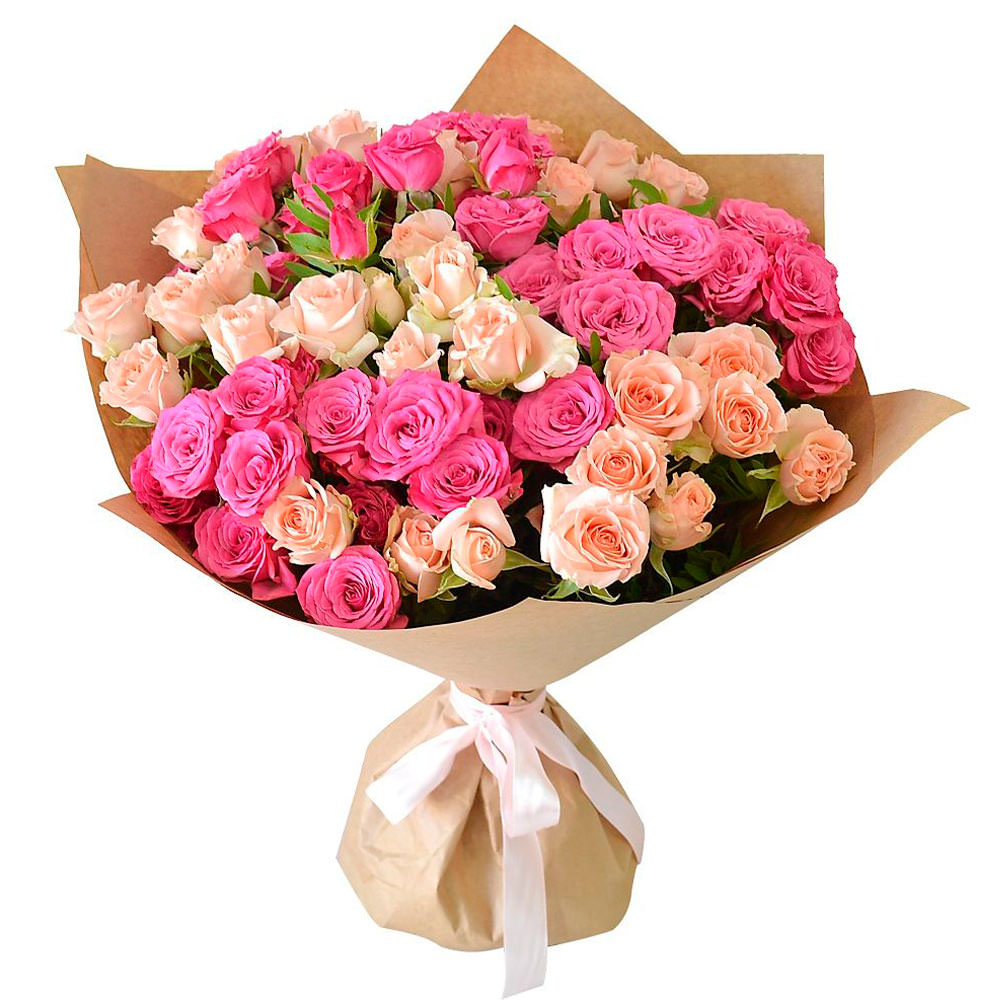 Роза кустовая микс (кремовая, розовая). Упаковка (лента, пленка, крафт, сетка, пленка матовая)