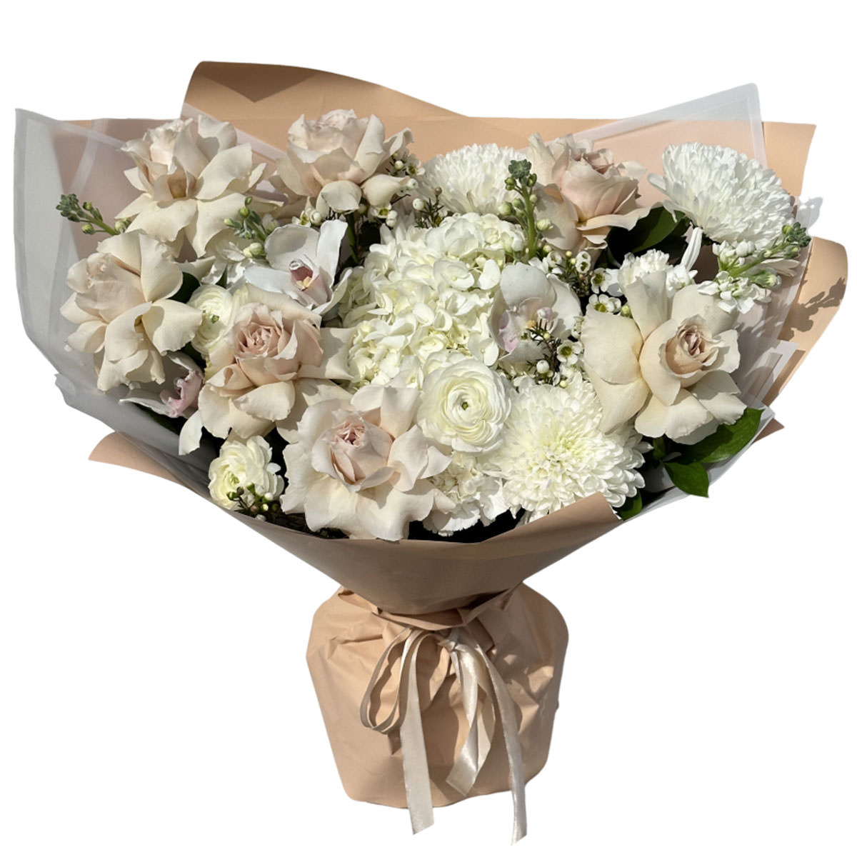 Роза одноголовая французская капучино, хризантема белая, гортензия белая, ранункулюс белый, орхидея белая, ваксфлауер. Упаковка (лента, пленка, крафт, сетка, пленка матовая)