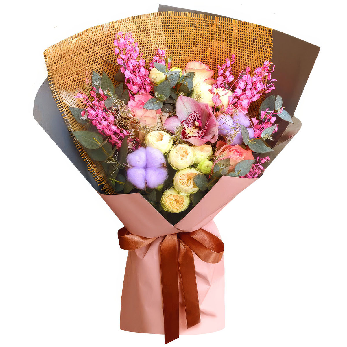 | Состав | Кустовые розы, Орхидеи, Пионовидные розы, Розы, Хлопок, Эвкалипт |