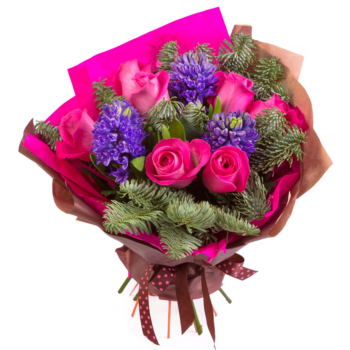 Роза одноголовая розовая, гиацинт фиолетовая, пихта. Упаковка (лента, пленка, крафт, сетка, пленка матовая)