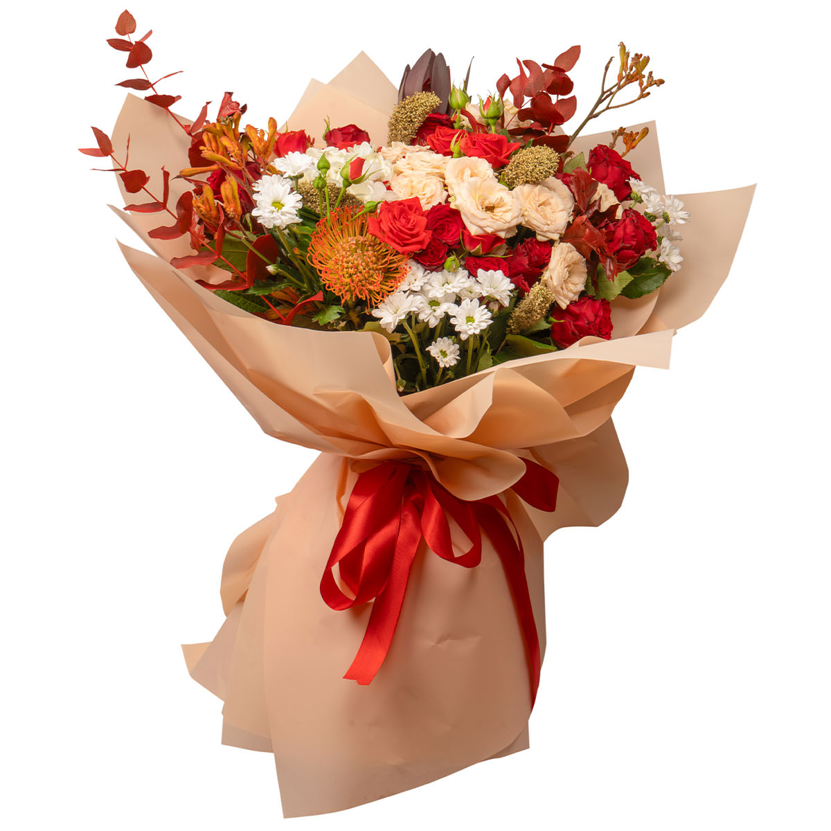 Роза кустовая кремовая, хризантема кустовая белая, леукоспермум (протея), зелень. Упаковка (лента, пленка, крафт, сетка, пленка матовая)