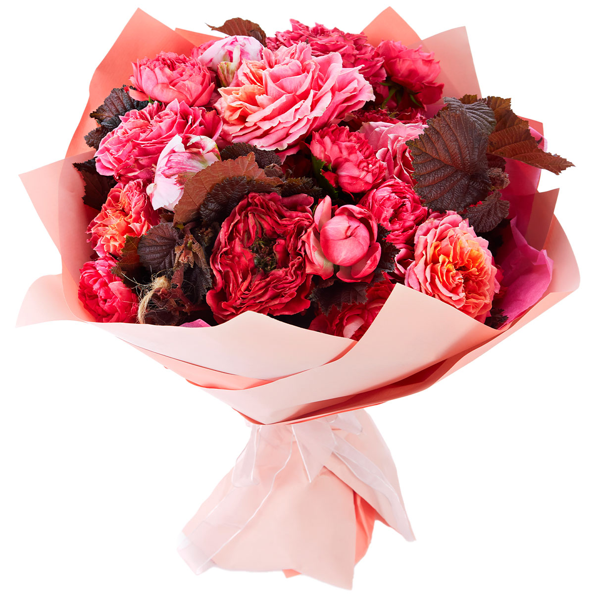 Роза пионовидная одноголовая красная и розовая, зелень. Упаковка (лента, пленка, крафт, сетка, пленка матовая)