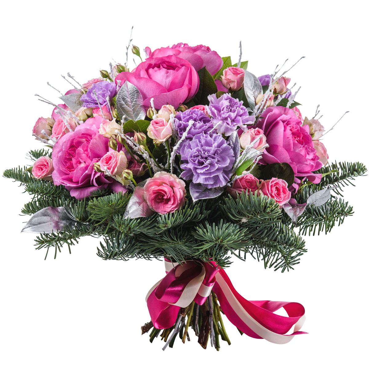 Роза одноголовая розовая, роза кустовая розовая, гвоздика сиреневая, пихта, искусственные веточки. Упаковка (лента, пленка, крафт, сетка, пленка матовая)