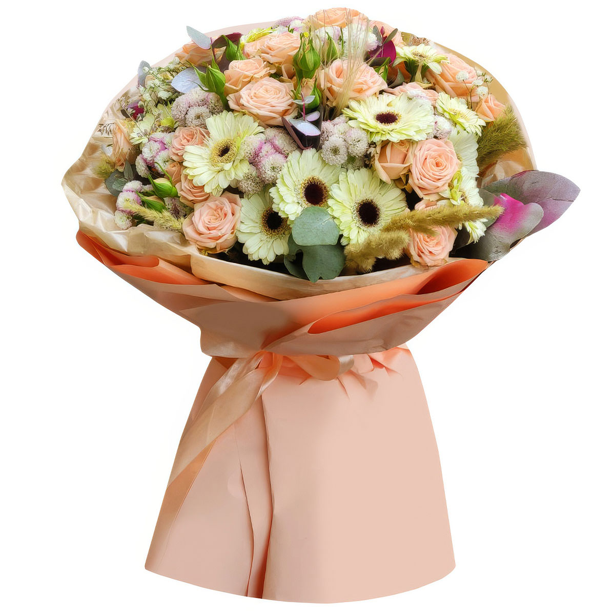 Гербера, роза кустовая кремовая, хризантема кустовая мини, лагурус, эвкалипт. Упаковка (лента, пленка, крафт, сетка, пленка матовая)