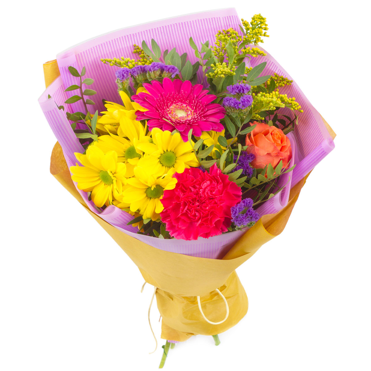 Хризантема кустовая желтая, гербера розовая, гвоздика розовая, роза одноголовая оранжевая, статица фиолетовая, солидаго, фисташка. Упаковка (лента, пленка, крафт, сетка, пленка матовая)
