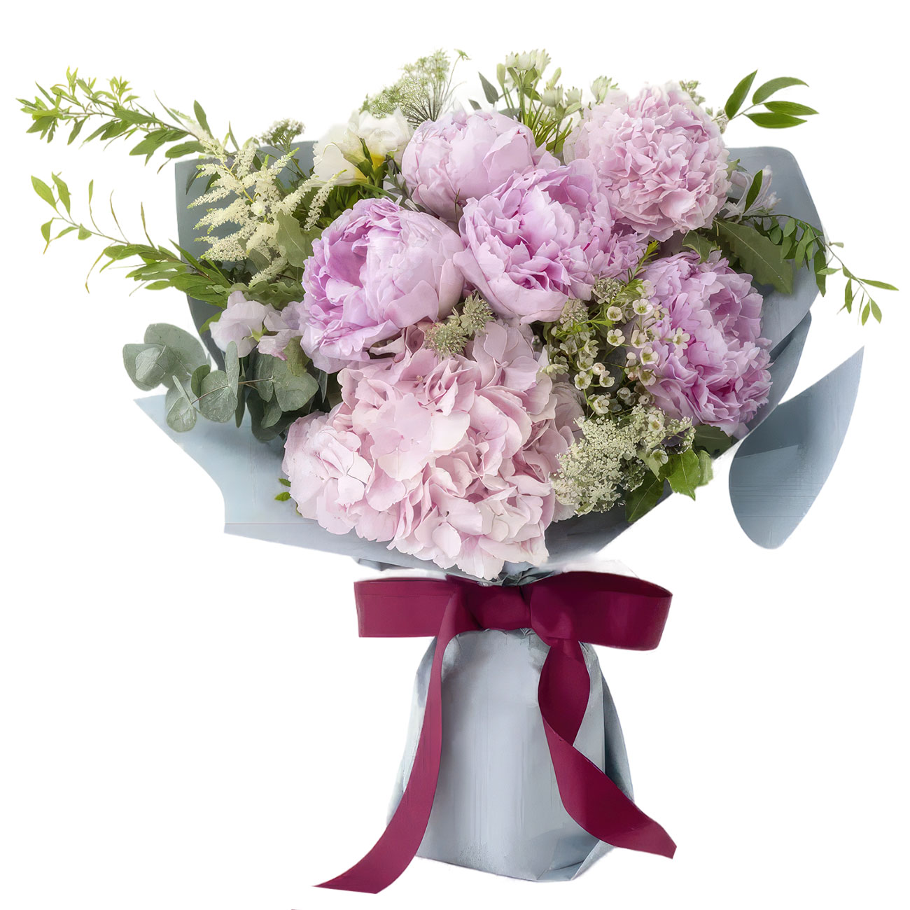 Пион розовый голландский, гортензия розовая, эустома белая, зелень, эвкалипт. Упаковка (лента, пленка, крафт, сетка, пленка матовая)