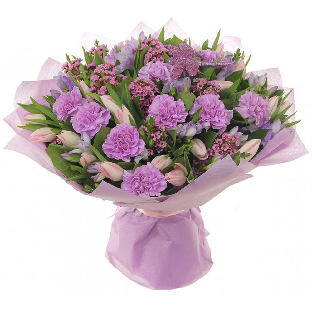 Гвоздика сиреневая, тюльпан розовый, ваксфлауэр. Упаковка (лента, пленка, крафт, сетка, пленка матовая)