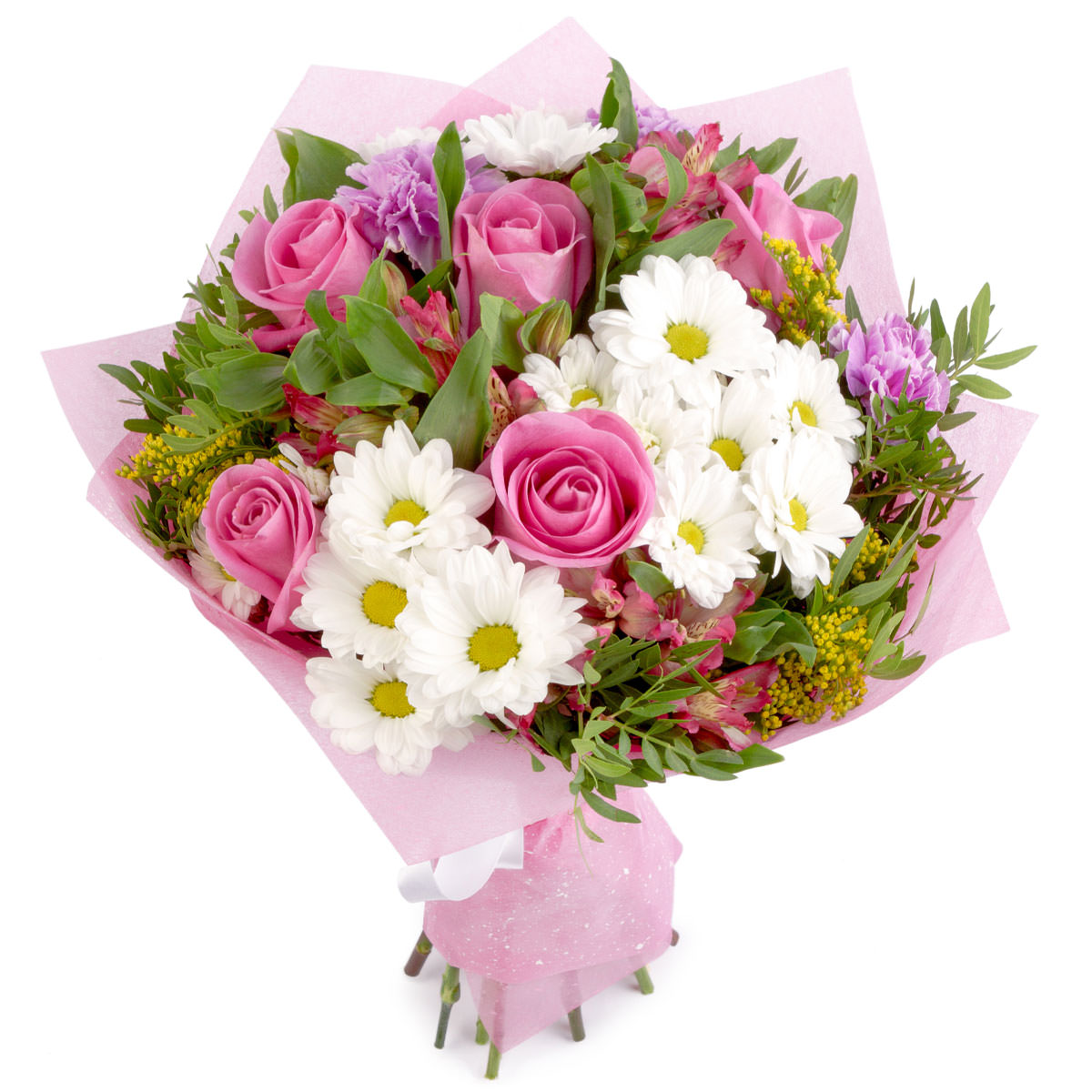 Роза одноголовая розовая, хризантема белая, гвоздика сиреневая, альстромерия розовая, фисташка, солидаго. Упаковка (лента, пленка, крафт, сетка, пленка матовая)