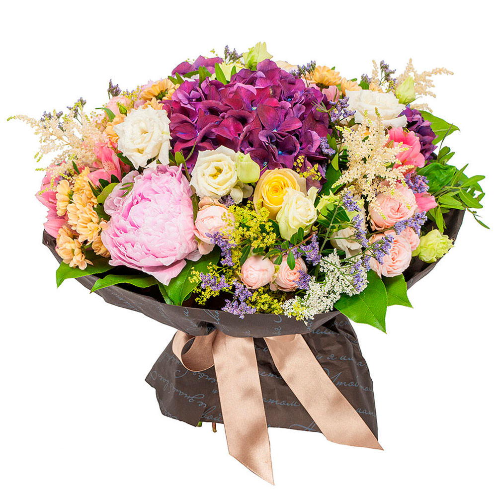 Гортензия сиреневая, пион розовый, роза кустовая нежно-розовая, роза одноголовая светло-желтая, хризантема кустовая персиковая, астильба, зелень. Упаковка (лента, пленка, крафт, сетка, пленка матовая)